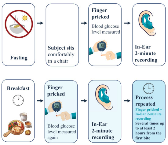 Four subjects, aged between 30 and 59 years, were recruited for this study, with one non-diabetic female, one pre-diabetic male, one type I diabetic male, and one type II diabetic male (Table 1). The participants were given detailed instructions and explanations about the recording protocol and were asked to attend the recording sessions in the morning while still fasting. Each participant attended the recordings over the course of 9 days. The BGLs were measured using the gold standard glucometer, while simultaneously the in-ear PPG signal was recorded for two minutes (starting within one minute of the glucometer measurement), and each recording was repeated twice. The BGL and PPG were first measured when a subject was fasting, then a varied and carbohydrate-rich (where permissible) breakfast was offered. Afterward, the BGL and PPG signals were measured at various intervals and at least up to 2 h after breakfast, as depicted in Figure 3. The total number of two-minute recordings acquired was 244, and the glucose levels varied between 65 and 345 mg/dL. It is important to note that during each recording day, the subject was asked to keep the sensor in their ear to minimize the variability between recordings and examine the comfort and ergonomic aspects of the proposed device. In addition, the lancets and test strips were safely disposed of after every finger prick and the subjects were asked to wash their hands with lukewarm water before and after each recording. All subjects gave a written informed consent for inclusion before they participated in the study. The recordings were performed under Imperial College’s ethics committee approval JRCO 20IC6414.