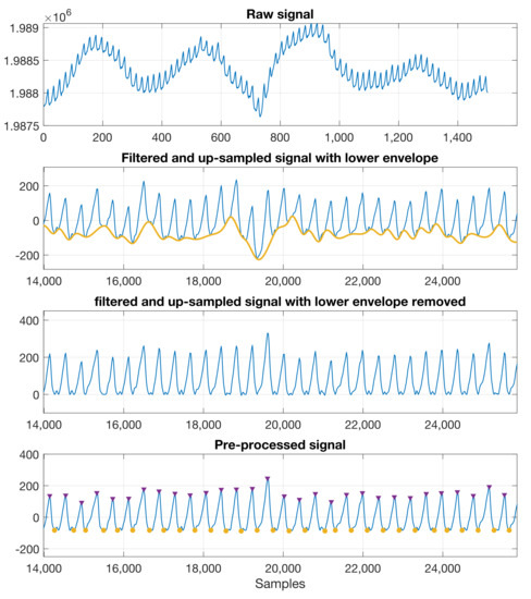 Pre–processing steps for the raw PPG. Top to bottom: raw signal; band–pass signal with the lower envelope detected; upsampled signal with the lower envelope removed; pre–processed signal with the peaks and troughs identified.