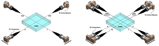 Three-dimensional representation of the experimental setups used to expose the 1 POF × 1 POF (left) and 2 POFs × 2 POFs (right) samples to the pressures selected with the LEDs and photodiodes coupled to each fiber.