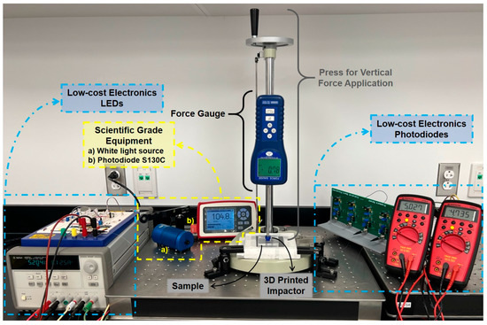 For the characterization of low-cost electronics, after testing the samples with the scientific-grade equipment specifically designed for optical measurements, the previously used equipment was replaced with the designed low-cost electronics. To obtain the peak emission wavelength of the LED, the supply voltage was regulated to obtain a current of 20 mA using a variable trimpot resistor. Similar to the previous setup, all visible light LEDs, photodiodes, and optical fibers were coupled using ST active mounts and ST connectors. The parameters of the electronic amplifier and filter circuits were adjusted by their variable gain resistors so that the output would give an approximate value of 5 V. Following the described experimental protocol, each PP was stressed at the selected pressures, and each new photodiode voltage was recorded manually (Figure 6).