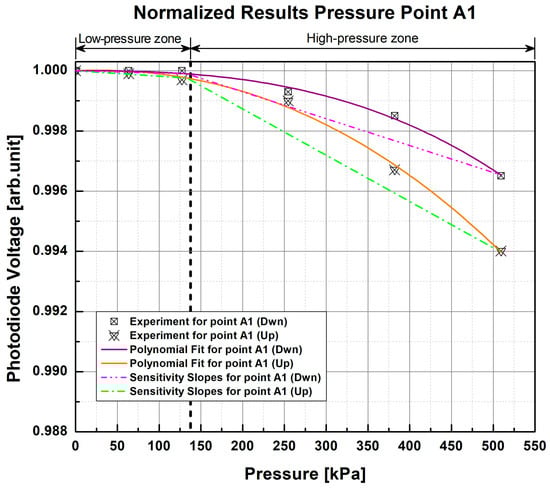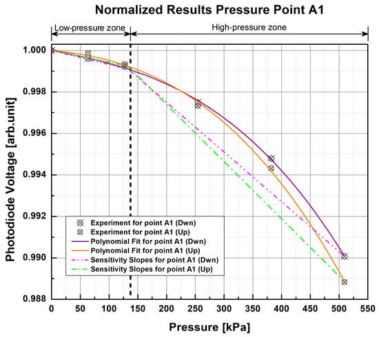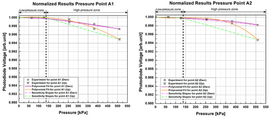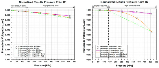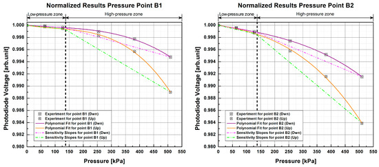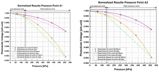 that best define the response of each fiber. The function that best describes the average of each pair of repetitions of every fiber was a third-order function (n = 3), where the coefficients , , and were calculated and the coefficient restricted to 1 () by the normalization of results. The third-order functions that characterize these curves have a goodness of fit (GOF) of , , and and were used to obtain photodiode voltage in the low- and high-pressure zones defined in order to calculate the average slope of each zone (dash-dot and dash-dot-dot lines in Figure 7, Figure 8, Figure 9 and Figure 10). In general, for the 1 POF × 1 POF sample, it was found that the low-pressure zone had an average slope of , while the high-pressure zone had a slope of . On the other hand, the 2 POFs × 2 POFs sample had an average slope of for the low-pressure zone and for the high-pressure zone. Comparing these results, it can be seen that the samples did indeed have greater sensitivity to high pressures owing to their steeper slope. Similarly, it can be observed in all the graphs that, despite being in the same PP, the fibers at the top (Up) of the fiber crossing of each pressure point were more sensitive than the one lying at the bottom (Dwn) because they suffered from greater attenuation of light due to fiber bending loss.