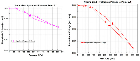 Finally, in Figure 11, we note the difference between light intensity values when the applied pressure was gradually and continuously applied upward and then reversed at PP A1 of the 1 POF × 1 POF sample with the low-cost electronics setup. Since the sensor is made of flexible and stretchable materials, we observe that the response curves (Figure 11) present some small hysteresis behavior, with curves overlapping in their maximum and minimum endpoints. Because PMMA and PDMS are both amorphous and viscoelastic materials, the observed small hysteresis may be attributed to a combination of chain relaxation, changes in free volume [37], and stress softening [38]. Stress softening is believed to be a primary factor for hysteresis in elastomers such as PDMS [38]. This has been observed in silica-filled PDMS, such as Sylgard 184, and is thought to arise from a decrease in filler–PDMS chain interaction and chain entanglement [39,40]. It can also be seen in these curves that, to reach minimum light intensity in the range of evaluated pressures, the same amount of pressure is required, irrespective of whether the fiber is placed on the top (Up) or bottom (Dwn) position.