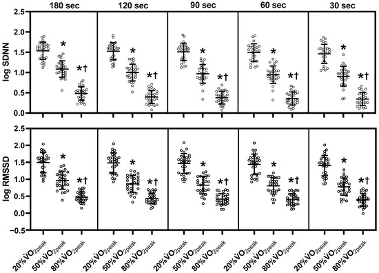 Changes of each ultra-short-term segment of time-domain HRV parameters during exercise. SDNN, standard deviation of all RR intervals; RMSSD, root mean square of successive RR interval differences; log, logarithmic; sec, seconds; , peak oxygen uptake. The middle line indicates the mean value. The top and bottom lines indicate the SD. The white plots indicate the individual data of participants. Note that there is missing data (see the Materials and Methods section). *, p < 0.05 vs. 20% ; †, p < 0.05 vs. 50% .
