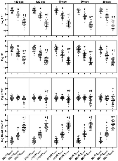 Changes of each ultra-short-term segment of frequency-domain HRV parameters during exercise. HF, high-frequency power; LF, low-frequency power; log, logarithmic; sec, seconds; , peak oxygen uptake. The middle line indicates the mean value. The top and bottom lines indicate the SD. The white plots indicate the individual data of participants. Note that there is missing data at 20% (see the Materials and Methods section). *, p < 0.05 vs. 20% ; †, p < 0.05 vs. 50% .