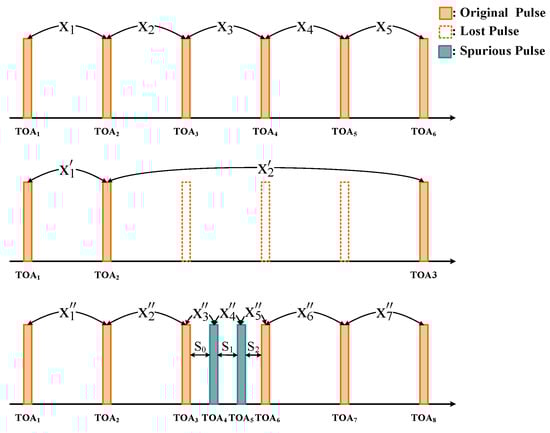 denotes an original PRI sequence of length L. The TOA of the t-th pulse can be described as . A non-ideal PRI sequence where j pulses are lost from the i-th pulse can be expressed as [26]: