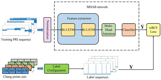 In this paper, a processing framework using a MHAB network for CPD is proposed. As shown in Figure 4, the framework consists of three modules. First, the values of the input PRI sequence are normalized into a unified range. Then, the label configuration module converts the corresponding change points set into a sequence of weighted change probabilities. Next, the MHAB network extracts features and finally generates the target probability sequence. In addition, a wBCE loss function is adopted to improve the fitting of the proposed network. The details of each of these processing steps are described in the following sections.