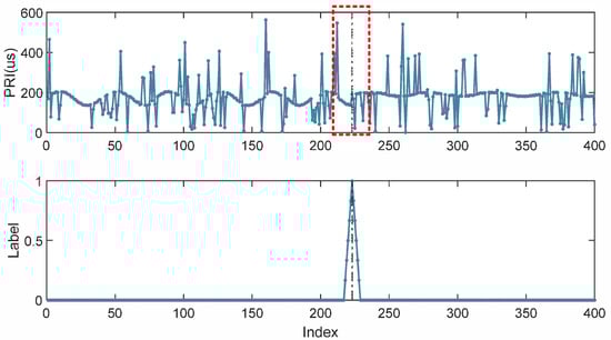 An input PRI sequence of length input is denoted as , where is the PRI value of the t-th pulse. The corresponding true label is denoted as , which expresses the probabilities that the corresponding pulses are the change points. Where and denote the input and the target spaces, respectively. The main task is to learn the model function , from a training dataset . For each training sample , is the input PRI sequence, and is the corresponding output associated with . Given a test sample , the trained function will output as the CPD result, is the predicted probability that the point corresponding to index t is a change point. As mentioned above, CPD is generally regarded in DL as a problem of binary classification, that is, the probability of judging whether the current point is a change point based on existing information. For this task, a special loss function and a unique neural network structure parameterized using a vector of weights need to be designed.