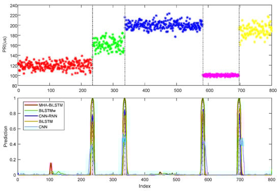 The different methods’ CPD performance on PRI sequences of different modulation types is presented in Table 3. It can be seen from Table 3 that the MHAB achieved the best effect under all the modulation types. Because the LSTM can learn long time sequence information, it showed a significant improvement compared with CNN. CNN-LSTM combines local spatial information and long temporal information, thus reducing the error rate. The Bi-LSTM allowed the model to learn the dependencies between the past and future of the data to better capture two-directional features, so its detection effect was also improved. The weighted BCE loss function constrained the acceleration of the network’s convergence and reduced the possibility of the output being drowned in noise, while the MHA mechanism further enhanced this effect. Since the constraint of wBCE loss function made the probabilities obtained by the network closer to 0 and 1, it can be seen from Figure 7 and Figure 8e that the predicted values of MHAB and Bi-LSTMw at the change point were also the highest, reducing the detection error caused by the peak threshold setting.