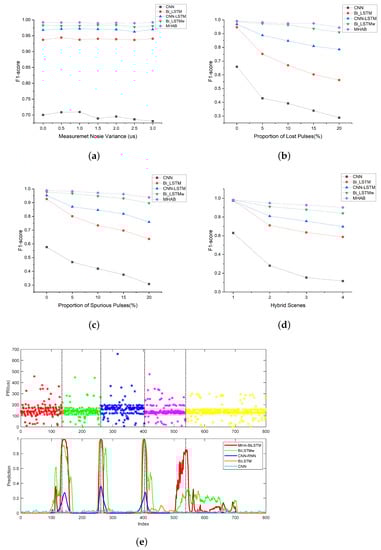 The MHAB significantly outperformed the other baseline methods in all non-ideal conditions. Figure 8a shows that the performance of all methods was almost unaffected by the increase in measurement noise variance. Figure 8b,c show that the total F1-score of MHAB was almost unaffected by the proportion of lost and spurious pulses, but the total F1-score of CNN, CNN-LSTM and Bi-LSTM decreases as the conditions become worse. In Figure 8d, as the hybrid conditions became more complex, the total F1-score of all methods decreased, inevitably. But the proposed method proved to be more stable. Because it lacks the ability to capture timing relationships, CNN exhibited the worst performance among all methods. Compared with CNN-LSTM and Bi-LSTM, Bi-LSTMw achieved better performance, thanks to the use of wBCE in training. However, the effective improvement of Bi-LSTMw due to the utilization of wBCE loss became less obvious as the percentage of spurious pulses increased. This was primarily because the original sequence features were not effectively extracted, owing to the overwhelming presence of noise. To compensate for this shortcoming, the MHA mechanism was adopted in the proposed method. As shown in Figure 8e, the stagger PRI sequence exhibited five work modes and corresponding four change points in the hybrid 4 scenario. However, the transition between the fourth and fifth work modes was not clearly visible in the noise. Including Bi-LSTMw, none of the four baselines were able to detect this change point. With the help of MHA, MHAB was able to focus on this transition well. Although hybrid scenes posed a higher challenge to feature extraction, the proposed method still achieved a 93.83% CPD accuracy with 15% spurious pulse, 15% lost pulse and 3 µs measurement noise.
