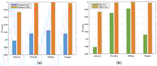 Figure 9a compared the performance of the original binary label and designed label. With different modulation types, the F1-score for designed label was considerably higher than original label corresponding to all the four types. The maximum gap was 8.08%. Summarizing, the superiority of label configuration in this study was verified.