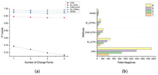 The effectiveness of change point numbers; (a) Result presented by F1-score; (b) Result presented by FN.