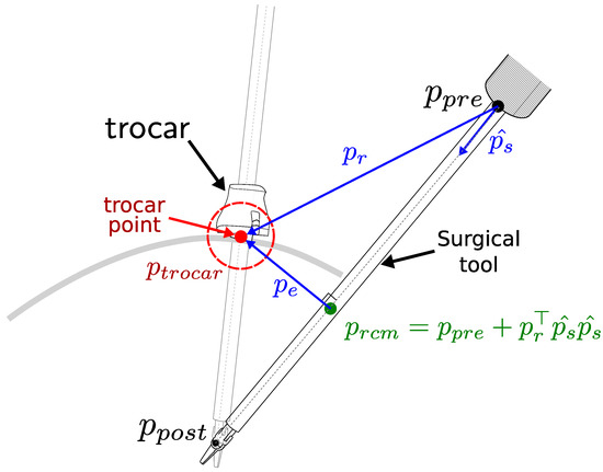 where indicates the direction of the surgical tool axis, and represents the difference between the position of the trocar point and the joint before the RCM. The vector denotes the vector to the trocar point from its nearest point on the tool axis .