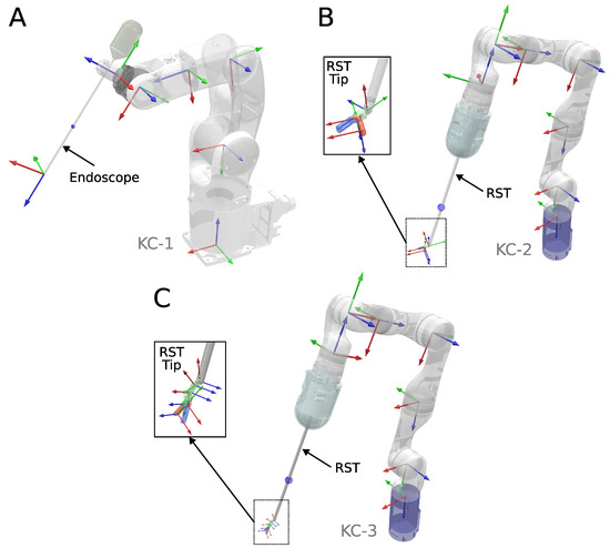 A simulation environment was developed in Coppeliasim [44] to evaluate the performance of various inverse kinematics solvers in redundant kinematic chains commonly found in RMIS applications, where endoscopes and surgical tools are frequently used. We considered three different kinematic chains, shown in Figure 2:
