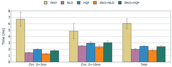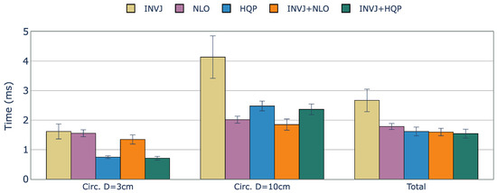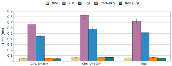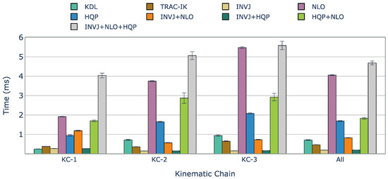 Figure 3 presents a comparison of computation times for the tested IK solvers. Orocos KDL, an inverse Jacobian solver with a truncated joint limits strategy, showed the lowest solve rate among all the IK solvers due to frequently getting stuck in local minima. On the contrary, TRAC-IK, which combines an inverse Jacobian IK solver and a sequential quadratic programming solver using a concurrent strategy, showed a high solve rate of 99.8% and an average computation time of 0.462 ms. However, INVJ and INV+HQP outperformed TRAC-IK, achieving similar solve rates with shorter computation times of 0.187 and 0.190 ms, respectively. The inverse Jacobian method with random restarts proved effective, even for highly redundant kinematic chains. HQP+INVJ takes the most advantage of the INVJ solver, achieving a short stopping time and performance similar to INVJ. NLO+INVJ also showed a significant improvement in the solve rate and computation time but was still far from INVJ and INVJ+HQP. The worst time performance is found in the INVJ+NLO+HQP solver, which is likely due to conflicts in shared resources among the three individual solvers. NLO and HQP solvers faced challenges in finding solutions, with an average solve rate of 80% and 78%, respectively. Since they are based on local optimizers, they are sensitive to initial guesses, and with the definition of random targets, the time to find a solution sometimes exceeds the timeout set at 10 ms.
