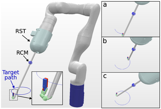 - Aghakhani, N.; Geravand, M.; Shahriari, N.; Vendittelli, M.; Oriolo, G. Task control with remote center of motion constraint for minimally invasive robotic surgery. In Proceedings of the 2013 IEEE International Conference on Robotics and Automation, Karlsruhe, Germany, 6–10 May 2013; pp. 5807–5812. [Google Scholar] [CrossRef]