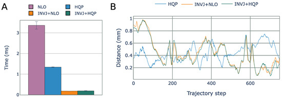 (A) Average IK solving time for the surgical tool pose control task. (B) RCM error for each IK solver obtained from motion capture for each step of the Lissajous trajectory.