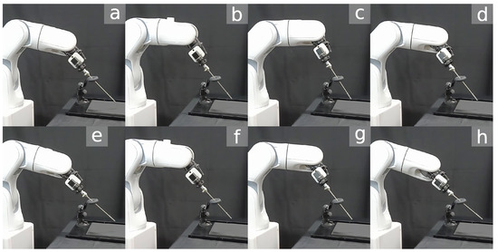 Snapshots of the robotic surgical tool tracking a 6-DOF Lissajous path subjected to an RCM constraint. The labels (a–h) indicate the sequence of the robot’s movement along the path.