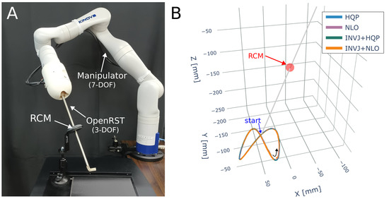with , , , and . The trajectory is divided into 2500 steps . The target orientation is fixed on a predefined rotation matrix , which corresponds to pointing toward the right side of the image in Figure 13. Markers are attached to the tool shaft to record deviations from the RCM constraint. The trajectory followed is shown in Figure 13B.