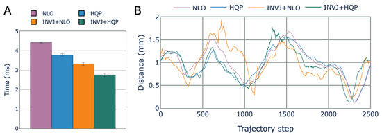 (A) Average IK solving time for the endoscope positioning task. (B) RCM error for each IK solver obtained from motion capture for each step of the helix trajectory.