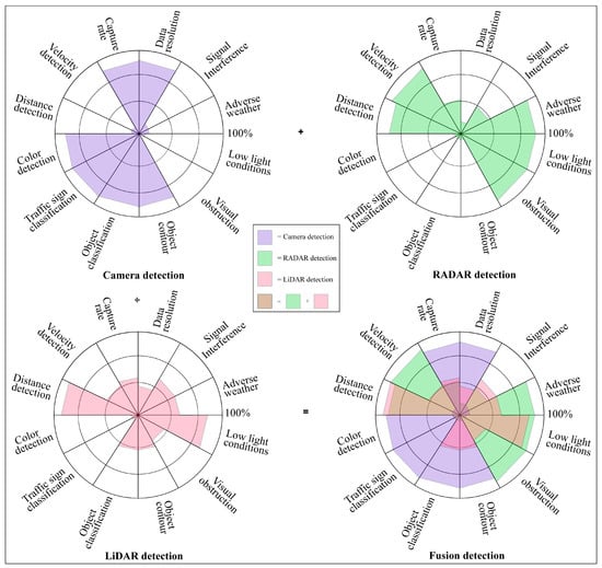 Detection capacity graphical view of AVs’ camera, RADAR, and LiDAR sensors with fusion detection.