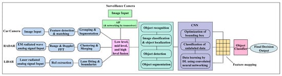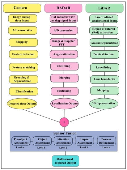 Sensor fusion also called multisensory data fusion or sensor data fusion is used to improve the specific detection task. In AVs, the primary sensors of cameras, RADAR, and LiDAR are used for object detection, localization, and classification. The distributed data fusion technology shown in Figure 5 is used in the proposed system. In five levels of data fusion technologies, wide-band and narrow-band digital signal processing and automated feature extraction are performed in the first level (level 0) fusion domain for pre-object assessment. The second level (level 1) or object assessment is the fusion domain of image and non-image fusion, hybrid target identification, unification, and variable level of fidelity. In the third and fourth levels (levels 2 and 3), situation and impact assessments are the fusion domain of the unified theory of uncertainty, the automated section of knowledge representation, and cognitive-based modulations. The fifth level (level 4) called process refinement is the fusion domain of optimization of non-commensurate sensors, the end-to-end link between inference needs and sensor control parameters, and robust measures of effectiveness (MOE) or measures of performance (MOP). The summarized flow chart of sensor fusion technologies [56,57,58,59] in AVs is shown in Figure 6.