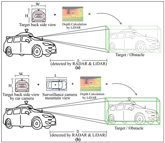 The proposed detection approach established a hybrid system to obtain the actual 4D formations of targets or obstacles where the actual height and width measurements are received by the car camera and the actual length measurement is received by the surveillance camera birds’ eye or mountain view, shown in Figure 7. Although in the conventional system the length is calculated by LiDAR 3D for obtaining the 3D bounding box, the proposed model’s 3D formation accuracy will be more accurate because of having an actual length received from the surveillance camera system. Moreover, researchers are working to replace LiDAR [61] with advanced RADAR systems as well as multi-sensed 3D camera imaging with AIP technologies because of some commercial use limitations of LiDAR such as its high expense, high signal interference and noise, and the problem of having rotating parts. “Will have or have not LiDAR”, the detection by surveillance camera systems, will be supportive for self-driving AVs in all conditions.