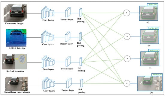 Comparative ADPA distributed fusion of different sensors. (a) Car camera, LiDAR, and RADAR detection, (b) car camera and advanced RADAR detection, (c) car camera, RADAR, and surveillance camera detection, and (d) FSCDS detection.