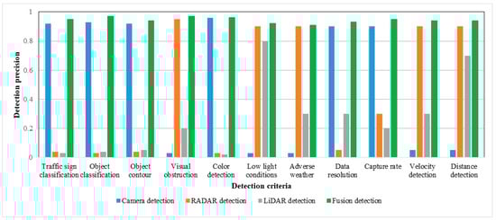 RADAR working performances are reliable in adverse weather and low light conditions and have very impressive sensing capabilities such as relative velocity detection, visual obstruction identification, and obstacles distance measurement but its performance may be decayed by signal interference. RADAR is not good for color detection, traffic sign or object classification, object contour, capture rate, and data resolution. LiDAR also has signal interference effects, but is sovereign for 3D mapping, point cloud architecting, object distance detection, and low light working capability. The cameras’ optical sensing is signal interference-free and decent in color detection, traffic sign classification, object classification, object contouring, data resolution, and capture rate. Camera, LiDAR, RADAR, and ultrasonic sensors have individual detection advantages and limitations [49,50,51,52], which are listed in Table 3. After summarizing and graphing, Figure 4 gives an overlooked view of different sensor detection [53,54,55].