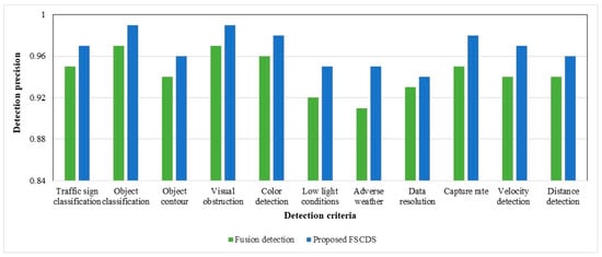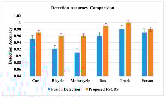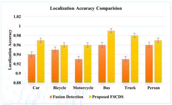 The individual approximate detection capability and a combination of sensor fusion detection are represented in Figure 15, where the detection probable assumption of sensors is between zero and one. The comparative diagram of car sensor fusion and overall fusion with surveillance camera detections is shown in Figure 16, where the proposed FSCDS’s overall detection capacity is much better than only car sensor fusion detection. In FSCDS, the surveillance camera provides extra information about obstacles, targets, and road conditions with an AI networking system that improves the overall detection capability of the fusion output. The comparison of the detection accuracy of fusion and FSCDS is shown in Figure 17, where the FSCDS detection performance is much better than the fusion value of car sensors. Figure 18 shows the localization accuracy comparison of fusion detection and FSCDS.