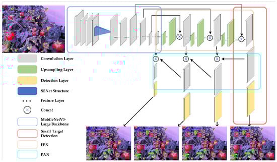 The integrated architecture of SM-YOLOv5 includes a backbone network (in blue) that was replaced with MobileNetv3-Large. The small-target detection layer added based on the original three-layer target detection model is represented by the red box. The FPN and PAN structures (in yellow and cyan boxes, respectively) were supplemented with a small object detection layer to enhance the detection of small targets.
