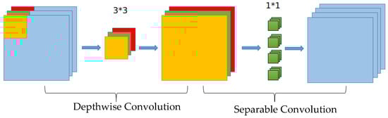 The CSPDarknet53 backbone network, utilized by YOLOv5, can effectively extract image features. However, due to the high computational resources and storage space requirements, its real-time detection applicability in embedded systems is limited. To address this issue, this study proposes the SM-YOLOv5 model, which employs MobileNetV3-Large as the backbone network for a lightweight design. MobileNetV3-Large is made up of numerous bneck units. In each bneck unit, depthwise separable convolution (DWS-Conv) is employed instead of conventional convolution operations to extract features while minimizing the number of parameters and computations. As presented in Figure 5, the depthwise separable convolution is partitioned into two stages. Initially, each input channel undergoes channel-by-channel depthwise convolution (DW-Conv), and then the output undergoes pointwise convolution (PW-Conv). A depthwise weighted combination is performed, and the final feature map is output []. The SE module (squeeze-and-excitation) channel attention mechanism [] is utilized in the channel separable convolution to enable the network to automatically identify the importance of each feature channel, leading to an enhanced effect. Finally, the residual network structure is utilized to alleviate the difficulty in feature transfer as the network depth increases. The detailed parameters of each layer of MobileNetV3-Large as the backbone network and the corresponding output layer are presented in Table 2 [].