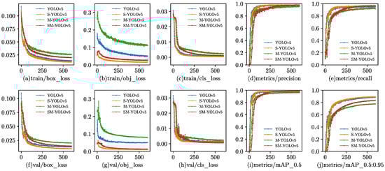 In order to provide a comprehensive comparison, all models were trained and validated using the same dataset. Figure 7 demonstrates the training process of the four models used: (1) the original YOLOv5 model; (2) YOLOv5 with a small-target detection layer, referred to as Small-YOLOv5(S-YOLOv5); (3) YOLOv5 with MobileNetv3-Large replacing the backbone network, referred to as MobileNetV3-YOLOv5 (M-YOLOv5); and (4) YOLOv5 with MobileNetv3-Large replacing the backbone network and a small-target detection layer, referred to as SM-YOLOv5. In the initial stages of all detection model training, the learning efficiency of the models was high, and the convergence speed of the training curve was fast. As the number of training epochs increased, the slope of the training curve gradually decreased and eventually stabilized. With an increase in the number of training epochs, the localization loss, confidence loss, and classification loss results changed, as shown in Figure 7a–c,f–h. It can be observed that each loss function gradually converged.