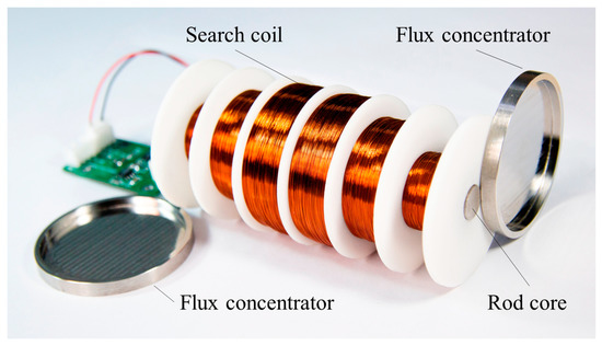 - Paperno, E.; Grosz, A. A miniature and ultralow power search coil optimized for a 20 mHz to 2 kHz frequency range. J. Appl. Phys. 2009, 105, 07E708. [Google Scholar] [CrossRef]