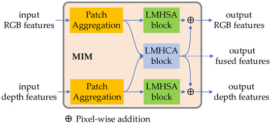 The proposed MIM module is used to execute feature extraction and bilateral RGB and depth cross-modal fusion strategies. As shown in Figure 3, Each MIM module consists of two patch embedding blocks, two LMHSA blocks, one LMHCA module and two summation units. The patch aggregation module, composed by a 2 × 2 convolution with the stride = 2 and layer normalization block, is used to aggregate patches into a single image and produce hierarchical representation. The LMHSA module is used to extract features by spatial-wise self-attention. The LMHCA module is to compute fused features based on cross-attention. The summation operation helps to achieve mutual information support.