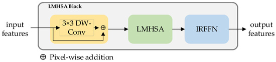 As shown in Figure 4, the LMHSA block contains three parts, which are local perception, LMHSA and IRFFN modules. The purpose of the local perception module [32] is to equip the model with the ability to extract local features while preserving its long-range capabilities. To avoid losing long-range information, a shortcut mechanism is incorporated. This particular element is visually highlighted in Figure 4 using yellow annotations. Next, we apply LMHSA computation to the feature transformation, represented in light green in Figure 4. To enhance the representation ability of tokens, we introduce the inverted residual feed-forward network module, or IRFFN, which can perform dimensional expansion and non-linear transformation on each token.