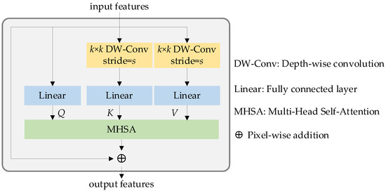 In the above formula, the dimensions of the query (K) and value (V) matrices are reduced to 1/s2 due to the application of stride s in the depth-wise convolution kernel. di is the dimension of Q. The structure of the lightweight multi-head self-attention module is depicted in Figure 5.
