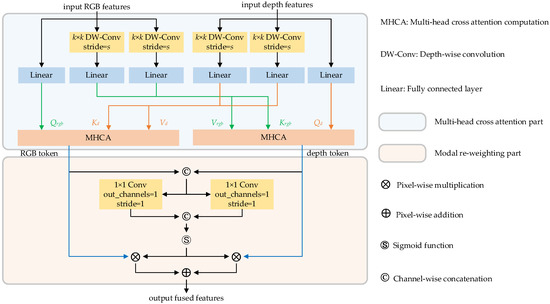 The token compounding method proposed by [38] has demonstrated outstanding performance in vision-and-language representation learning. Building upon this approach, we propose a lightweight multi-head cross-attention method to facilitate the fusion of RGB and depth features in robotic gripping applications. The lightweight multi-head cross-attention unit comprises two parts: a multi-head cross-attention component and a modality reweighting-based feature fusion component. Figure 8 presents a detailed schematic of the proposed procedure. Specifically, in the cross-attention module, we employ linear layer to acquire matrices Qrgb, Qd for RGB and depth streams, respectively. Depth-wise convolution and linear mapping are used to obtain the matrices Krgb, Vrgb, Kd, Vd accordingly. Then, the lightweight cross-attention computation can be expressed as Equation (6).