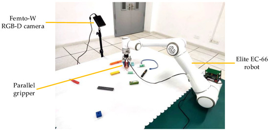 We set up a real-world robot grasp scenario, as depicted in Figure 10. For this experiment, we gathered 30 distinct objects on a desk. An Orbbec Femto-W RGBD camera was used as the image sensor, while a parallel gripper was installed at the end of the Elite EC-66 collaborative robot to act as the clamping mechanism. Prior to the experiment, a hand-eye calibration was performed to ensure proper operation of the system.