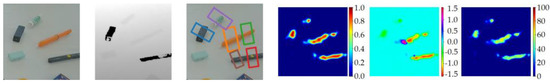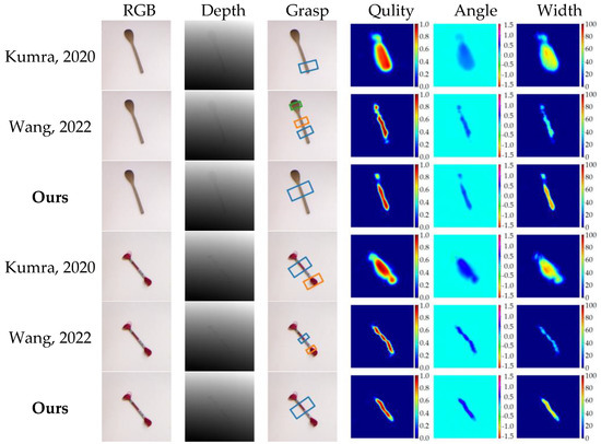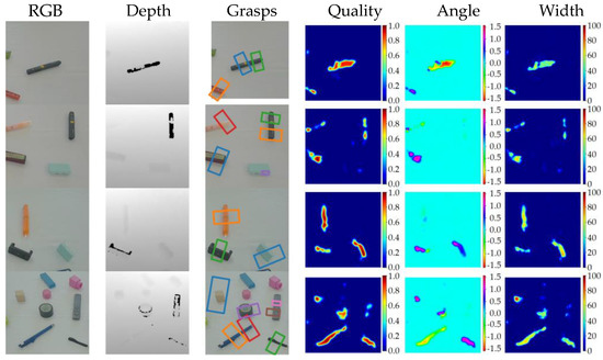 Figure 11 depicts some typical examples of heatmap regression results for quality, angle, and width, as well as grasp detection results. As shown in the figure, the quality heatmaps demonstrate the robustness of our proposed method, which contributes to the superior performance of our grasp detection results.