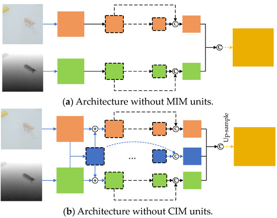 Architectures in ablation experiments: (a) has no MIM blocks; and (b) has no CIM blocks.