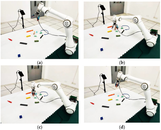 Four grasp stages in the physical experiment: (a) shows the initial position and posture of EC-66 robot. In this stage, grasp detection is performed. After detection, the parallel gripper moves to the effective grasping position, which can be seen in (b). The gripper then grasps the target, which is shown in (c). The robot completes the target grasping task in (d) finally.