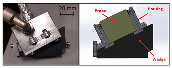 The selected phased array probe had a maximum operating temperature of 60 °C; therefore, a water-cooled housing was required to ensure that the wedge top and the probe remained cool during operation. Figure 5 presents the adopted wedge and probe configuration.