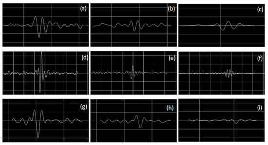 A-Scans obtained for: (a) weld root notch at 18 °C, (b) weld root notch at 122 °C, (c) weld root notch at 200 °C, (d) weld toe notch at 18 °C, (e) weld toe notch at 120 °C, (f) weld toe notch at 203 °C, (g) lack of fusion at 18 °C, (h) lack of fusion at 120 °C, and (i) lack of fusion at 201 °C.
