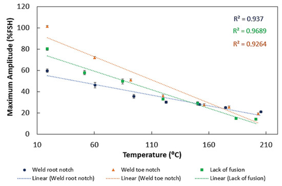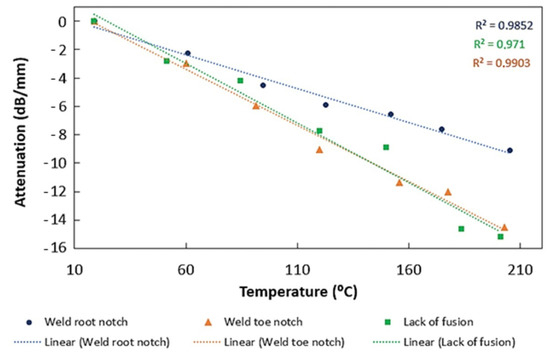 Figure 8 shows the attenuation change with temperature for different defects. In all cases, it is possible to observe an attenuation decrease with higher temperatures. This decrease is most evident for the weld toe notch and lack of fusion defects. These results support those obtained for the maximum amplitude variation with temperature for different defects—Figure 9. As shown, as attenuation increased with higher temperatures, the signal amplitude also reduced; however, the decrease was lower for the weld root notch.