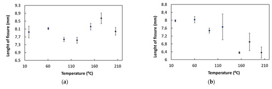 From the obtained results analysis, it is possible to verify apparent variations in the defects’ dimensions along with temperature variations. Figure 10 shows the defects’ apparent length variation with increases in temperature. One possible explanation is, for instance, a compromised contact between the ultrasonic transducer and the piece due to the different thermal expansion coefficients of the two materials [30,31]. For the defect weld root notch, there was an irregular variation as the temperature increased. For the weld toe notch defect, it was possible to observe some irregularity, as the size of the defect decreased as the temperature increased. However, this apparent defect dimension variation was lower for lack-of-fusion defects up to temperatures of around 200 °C. At the highest evaluated temperatures, a decrease in the value of the defect dimension was observed. The major error source was related to the ultrasonic velocity being a function of temperature, with variations in the ultrasonic wave velocity at high temperatures [30]. Measurement errors can be minimized using a moving gate control with temperature variations, normalization of the signal amplitude, automatic determination of the ultrasonic flight time, and temperature compensation.