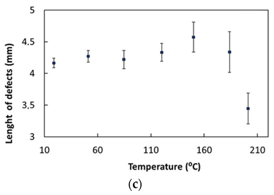 Variation in the length of defects with temperature, for (a) weld root notch, (b) weld toe notch and (c) lack of fusion.