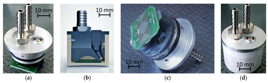 Construction process and chassis parts for the probe developed for the inspection of the pipe base material at high temperature. (a) PCB probe and lid assembled; (b) probe CAD cross section; (c) PCB probe and lid (view from bottom); (d) Assembled probe.