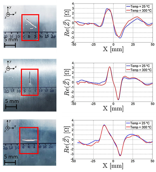 For the experimental validation of the base material probe in Figure 12, three rectangular defects were artificially produced, being 0.5 mm wide, 0.4 mm deep and 10 mm high and with an angle of 0°, 45° and 90° in a 329 mm diameter 16Mo3 steel pipe. The gathered results shown in Figure 14 were obtained at 1 MHz frequency while the probe travelled in the X direction, centered with the defect. Through the superposition of the signals, the characterization of the defects did not suffer from temperature increases, which indicates that the probe cooling was effective.