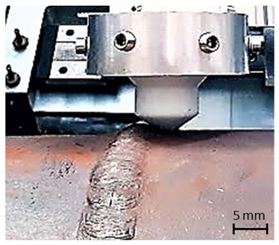 Figure 17 shows the defects present in the weld beads—approximately 8 mm long, 1 mm wide, and 3 mm deep. One centered with the weld bead and one was at the weld bead’s border with the base material. Besides the background signal resulting from the weld bead surface profile variations, a signal peak caused by the defects’ presence stood out.