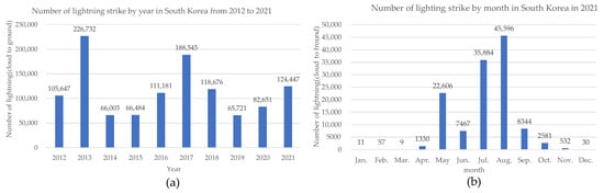 (a) Number of lightning strike by year in South Korea from 2012 to 2021. (b) Number of lightning strikes by month in South Korea in 2021.